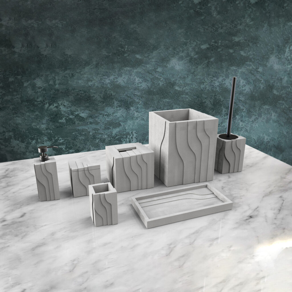 Incorporating natural elements, depicting the appearance of flowing water, and featuring a neutral and minimalist exterior, this design is suitable for various styles of bathroom environments.